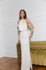 Meet our Aria Gown — a fluid, draped silhouette designed for effortless style and elegance. Crafted in a milky off white, silky jersey viscose , this piece features a classic halter neckline, that is fully adjustable and completed with freshwater pearl detail at the tie ends for a timeless detail. The fabric cascades softly over the body with delicate gathers, falling gracefully to the floor. Complete with a  sensual open back and ruched center detail add a touch of allure, making the Aria Gown a timeless addition to any wardrobe.